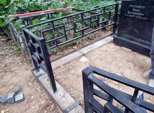 Клиент заказал у нас комплексное оформление места захоронения, в которое входят: классический горизонтальный памятник из чёрного гранита с прямоугольным цветником, простая металлическая оградка, а также наземное покрытие места захоронения гранитной брусчаткой. В первый наш приезд на кладбище могила выглядела следующим образом: два деревянных крестика и простое ограждение.